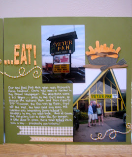 Here is yet another lay-out from our vacation last summer, illustrating what I consider to be the real purpose of scrapbooking: preserving and commemorating great moments in personal history. To that end, the "decorating" does not have to be excessive. This is a pretty simple lay-out, featuring the photos above all, with a generous dose of journalling to confirm the who/where/what/why. Enlargements of the picture sometimes create enough detail.